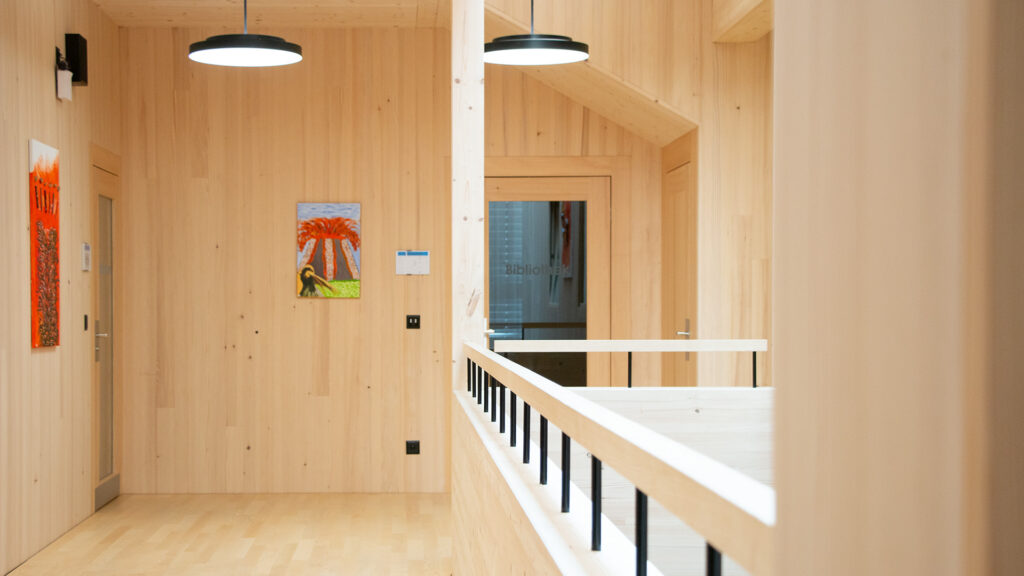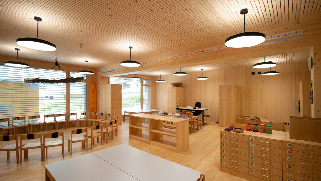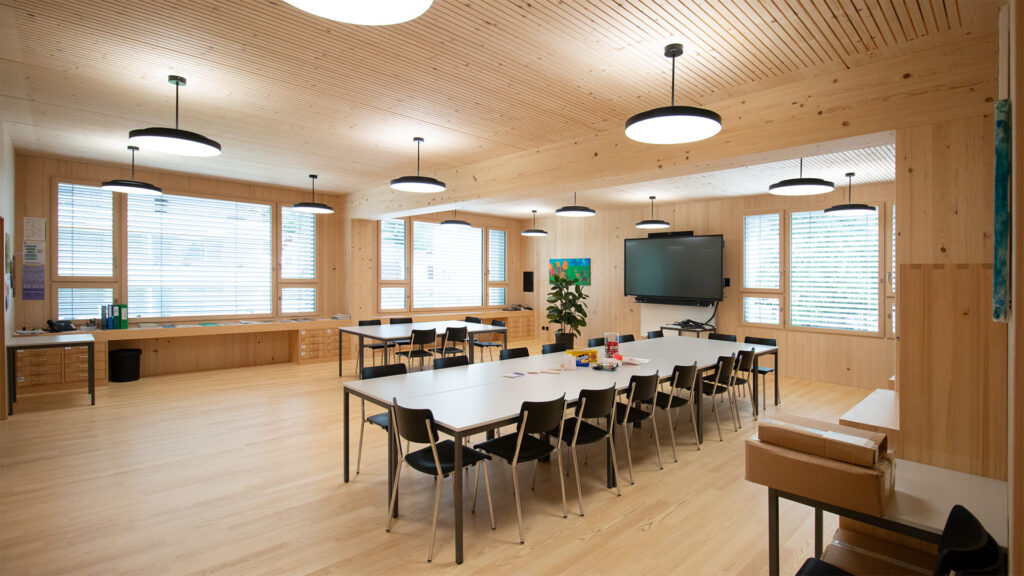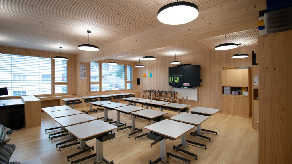 Im Innenausbau produzierte unser Team Schreinerei verschiedene Möbel für die Schulzimmer. Diese wurden mit speziellen Fingerzinken-Verbindungen hergestellt, welche eine spezielle Optik verleihen.