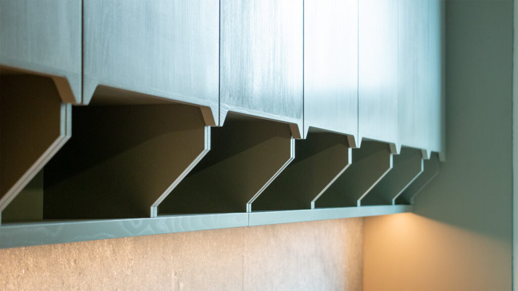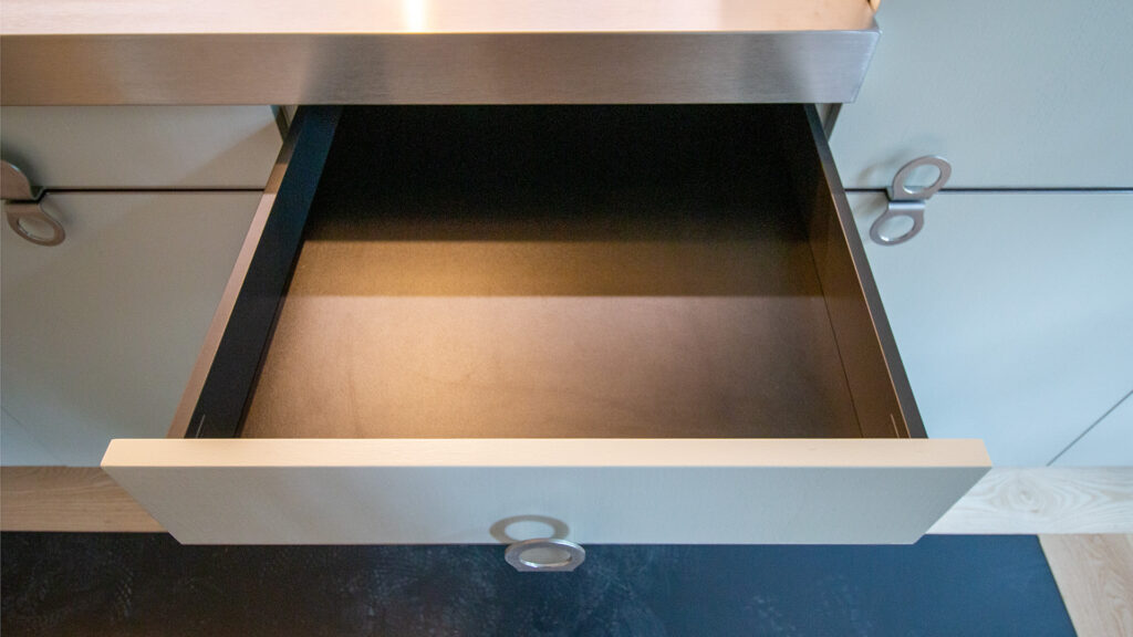 Um die Harmonie zu komplettieren, wurden die Fronten passend zum Stein in einem schicken Pistaziengrün gespritzt.