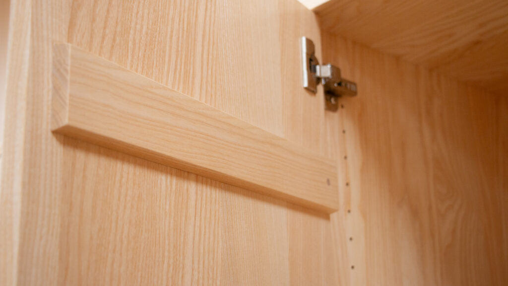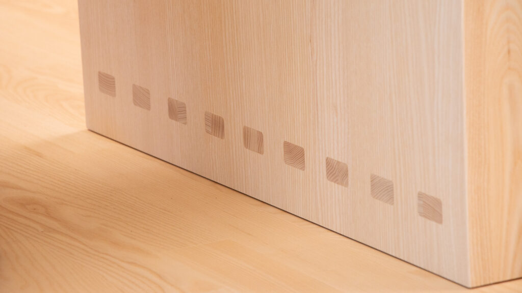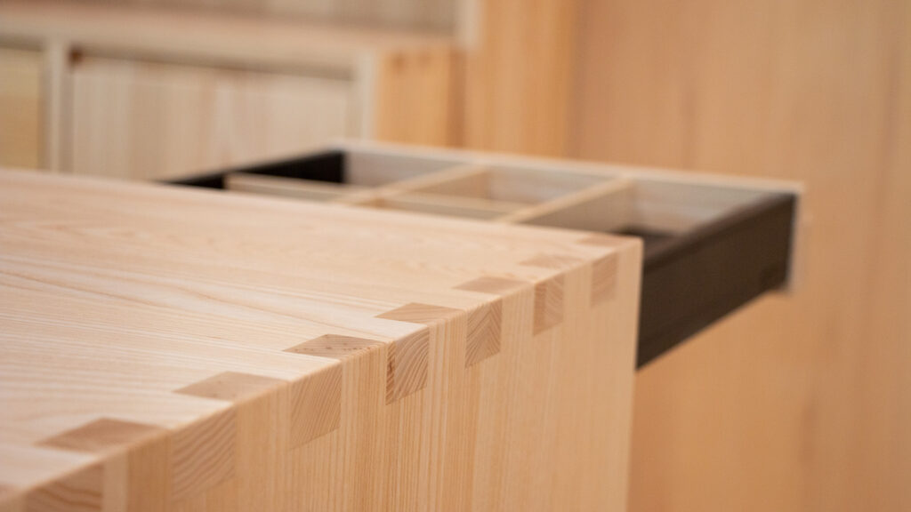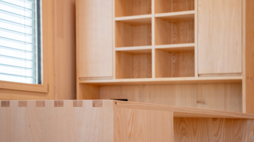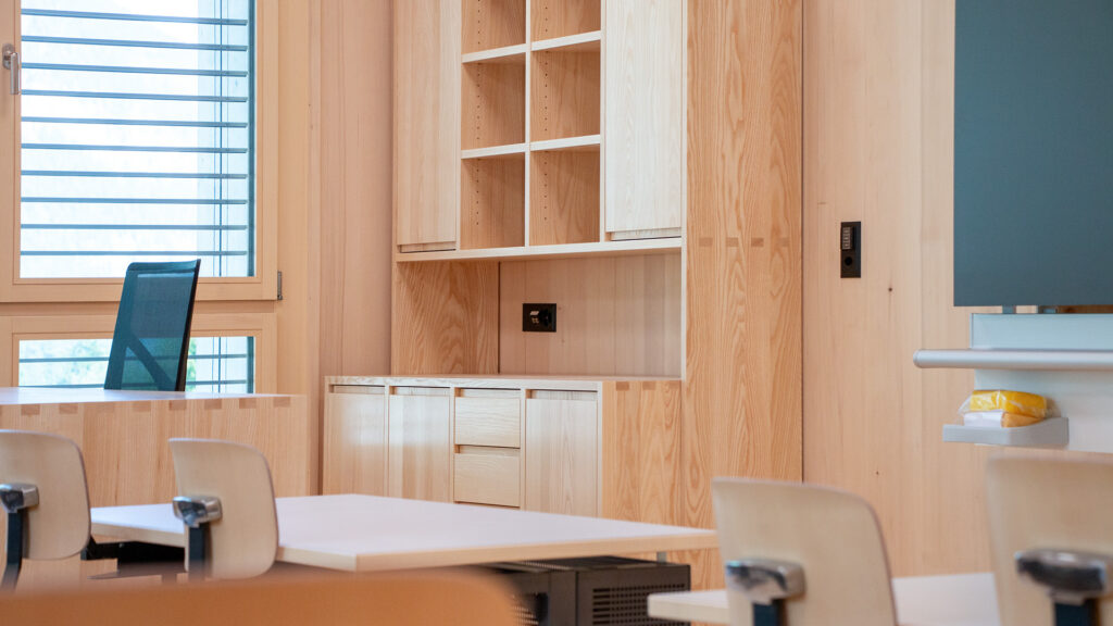 Unsere Schreinerei hat eine Vielzahl von Möbelstücken, wie Tisch, Schränke und Ablagen, mit speziellen Fingerzinkenverbindungen hergestellt, die für das Schulgebäude in Flims bestimmt sind.