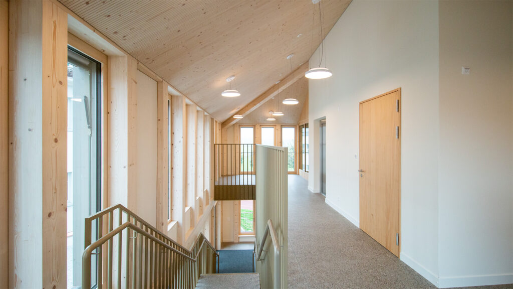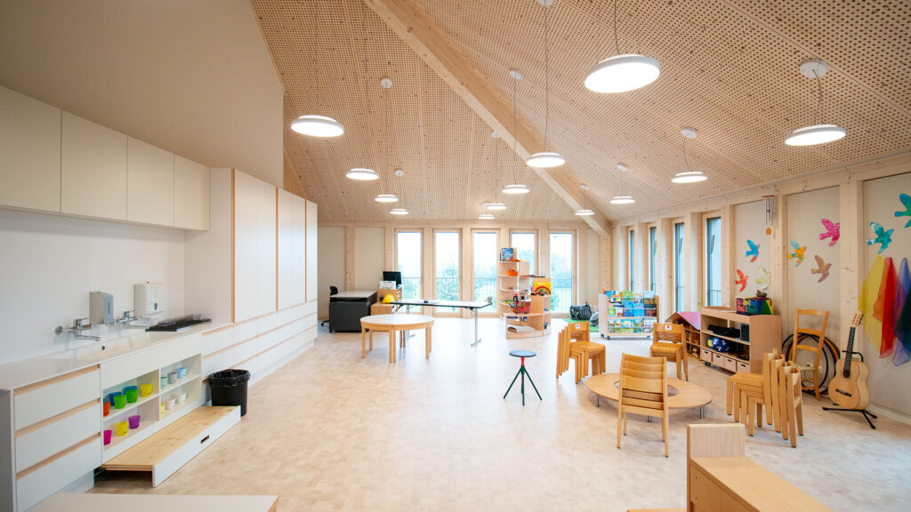 Drei Kindergartenklassen unter einem Dach. Mit diesem Ziel wurde in Niederwil (SG) ein neuer Kindergarten realisiert. Das Gebäude wurde in kompletter Holz-Elementbauweise vorproduziert und innerhalb weniger Tagen komplett aufgerichtet.