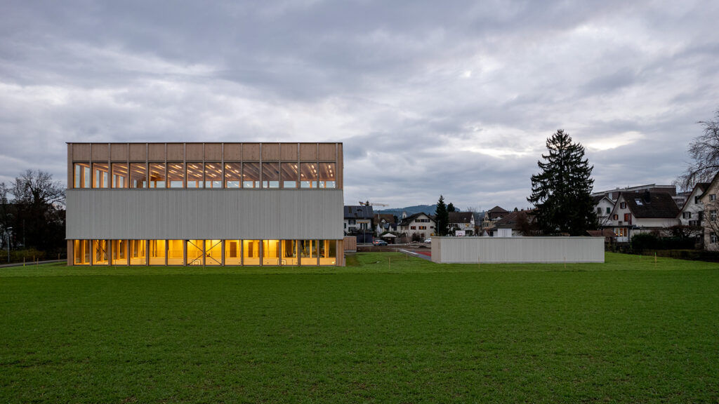 Das Hauptgebäude ist als kompakter, im Grundriss quadratischer, Baukörper ausgeführt. Das komplett in Holzelementbauweise erstellte Gebäude beinhaltet 2 Hallen auf 2 Etagen.